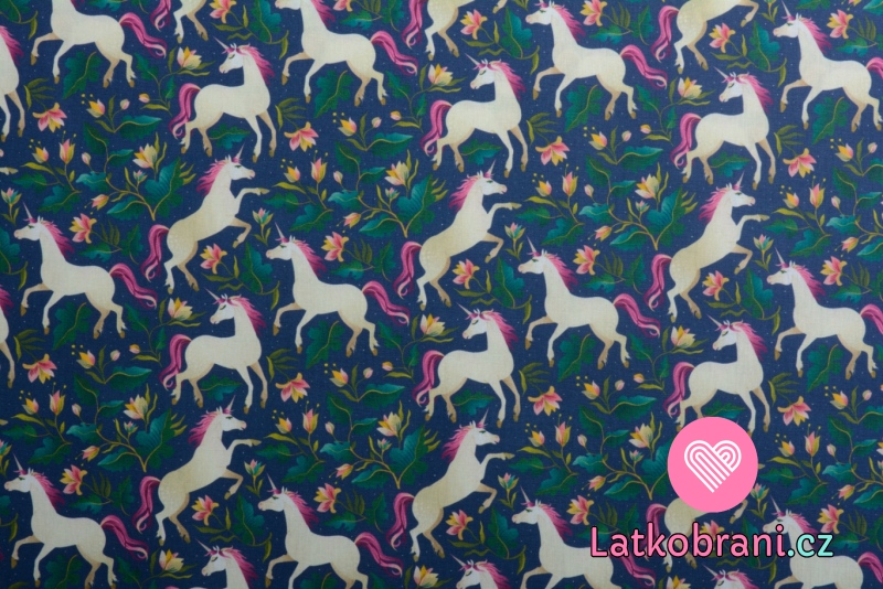 Bavlněné plátno jednorožci mezi květy na tmavě modré