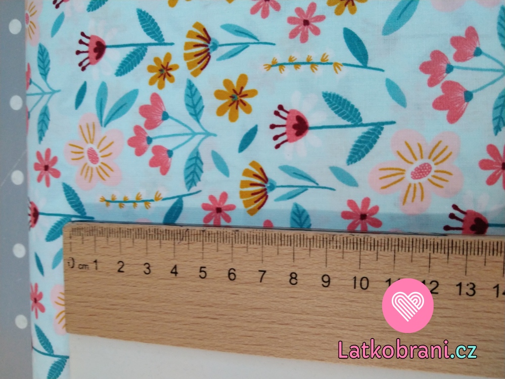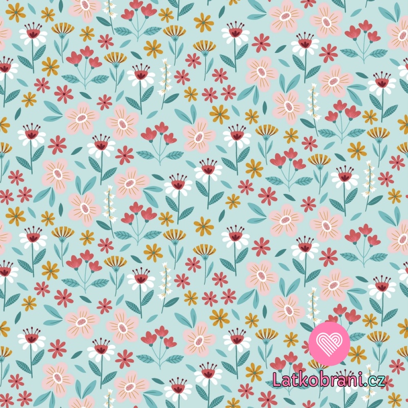 Bavlněný popelín rozkvetlé kytičky na světle tyrkysové