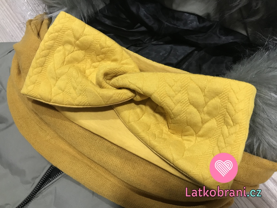 Pletenina copánky hořčicové Šířka: 150 cm Gramáž: 340 g/m² Složení: 81% polyester, 16% viskoza, 3% elastan. Certifikát o zdravotní nezávadnosti.