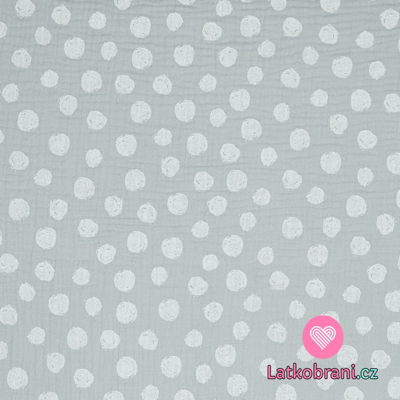 Dvojitá gázovina / mušelín nepravidelné puntíky na světle šedé, BIO