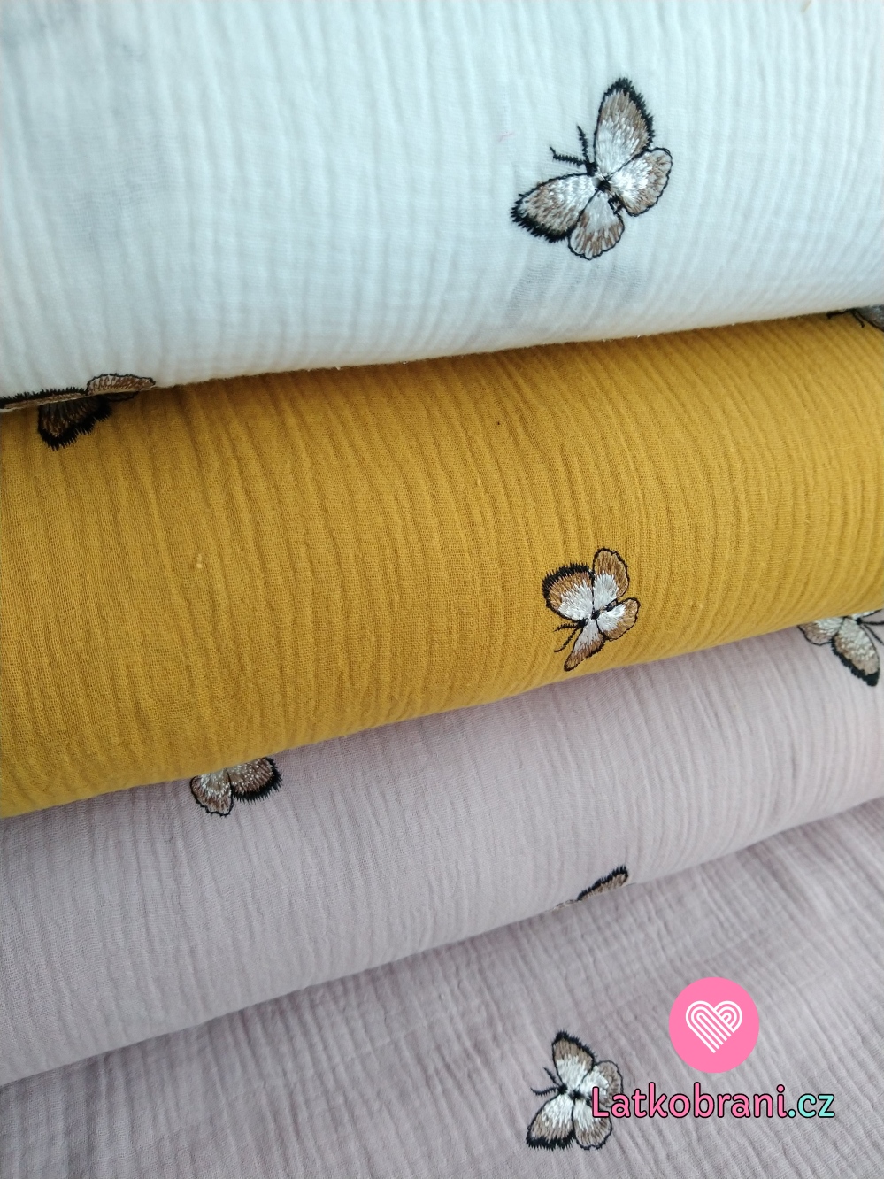 Dvojitá gázovina neboli mušelín je lehká, vzdušná, prodyšná bavlněná tkanina. Přitom je dostatečně pevná, odolná, jednoduchá na údržbu. Je příjemná na tělo a dobře saje pot, je proto ideální do letních veder. Je také ideální volbou pro výrobky pro miminka, neboť otevřená vazba tkaní a lehká struktura umožňuje mušelínu „dýchat“ a zajišťuje dostatečnou cirkulaci vzduchu, čímž snižuje riziko přehřátí. Tato vlastnost pomáhá udržet Vaše dítě v pohodlí, bezpečí a Vás v klidu.
