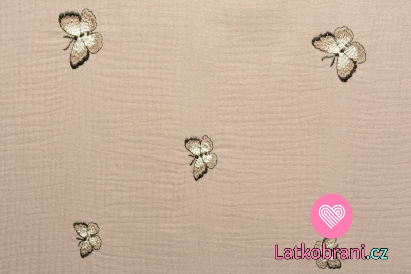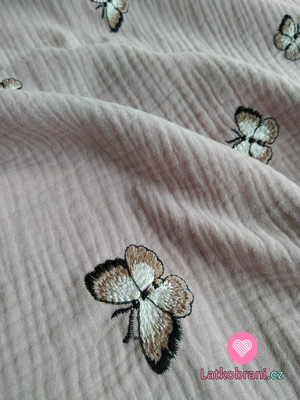 Dvojitá gázovina / mušelín starorůžový s výšivkou motýla
