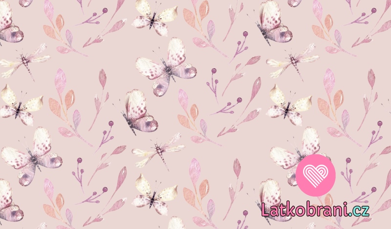 Teplákovina potisk motýli mezi větvičkami na růžové