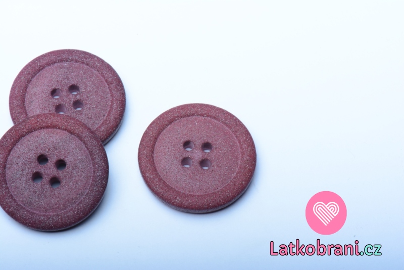 Knoflík kulatý, čtyřdírkový, matný vínový s jemnými krupičkami