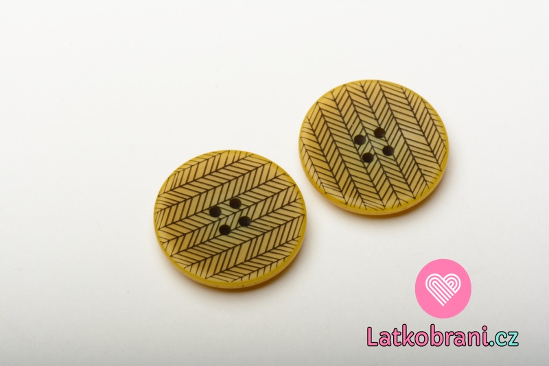 Knoflík kulatý, čtyřdírkový, okrový s "copánky"