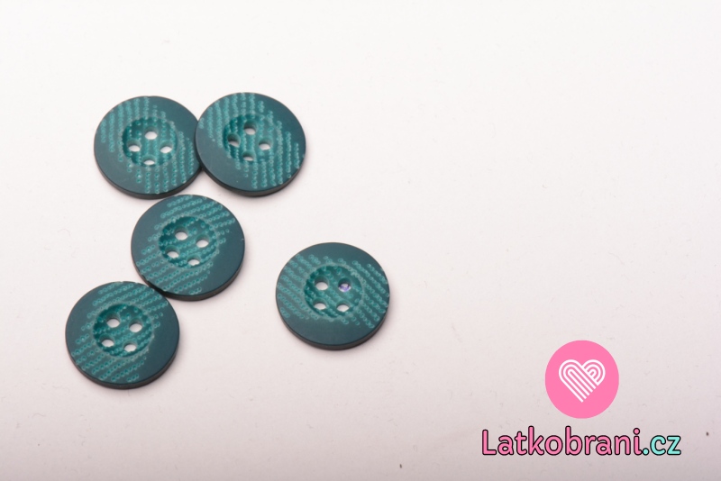 Knoflík kulatý, čtyřdírkový petrolejový s tečkami v pruhu uprostřed