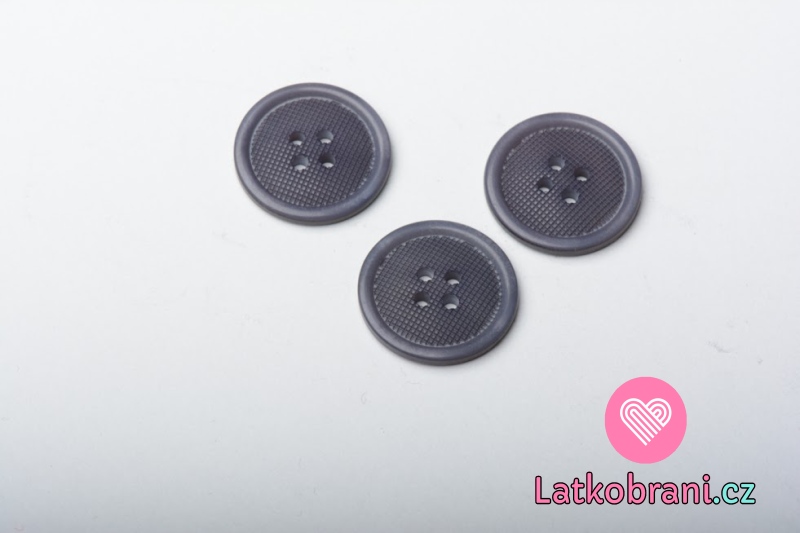 Knoflík kulatý, čtyřdírkový, tmavě šedý uprostřed kostičkový vzor