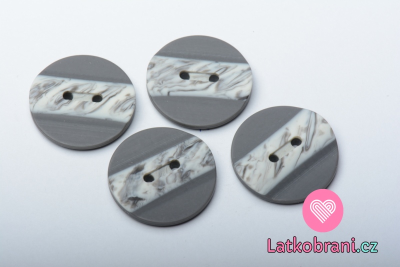 Knoflík kulatý, matný šedý s žíhaným plastickým pruhem uprostřed - velký