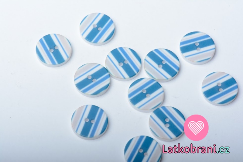 Knoflik potisk modré a šedé proužky na bílé
