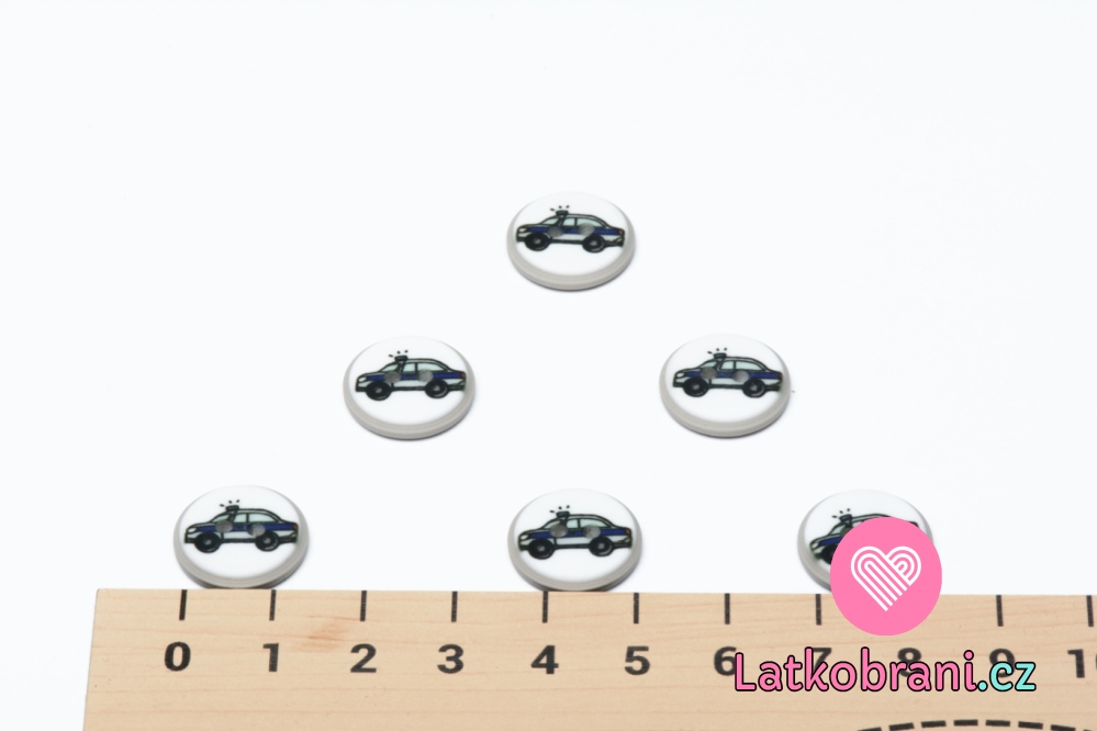 Knoflík šedý kulatý, dětský houkající auto na bílé