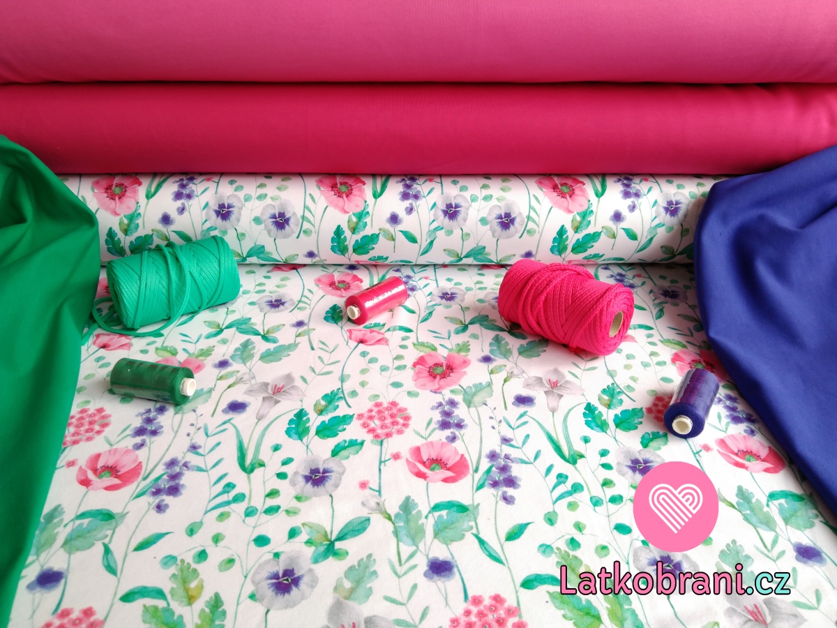 Teplákovina potisk malované květiny na bílé, BIO
