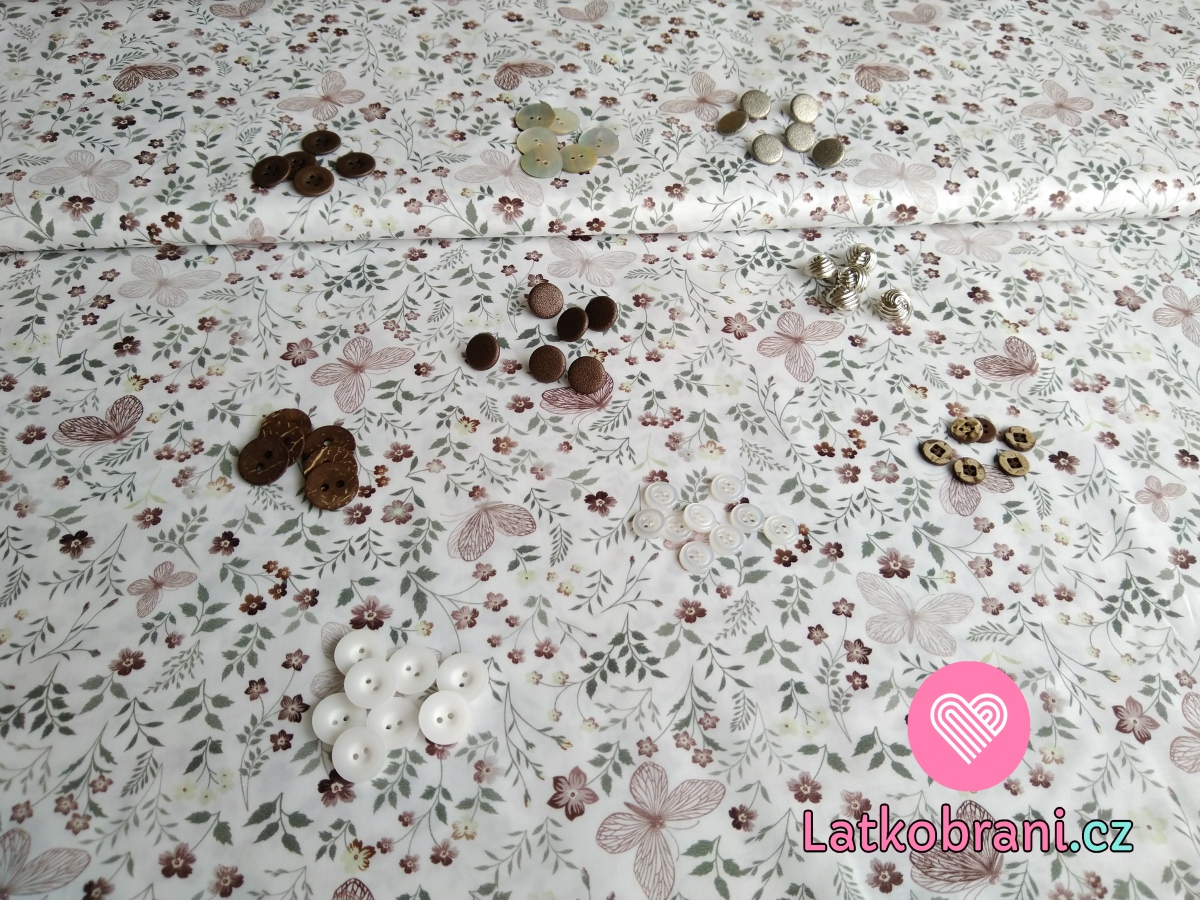 Bavlněná halenkovina (voál) potisk motýlci mezi béžovo - hnědými kvítky na bílé