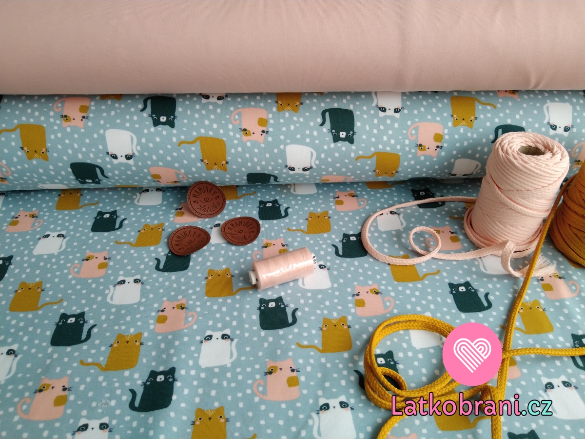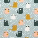 Teplákovina počesaná potisk kočičky na šedomodré, BIO