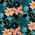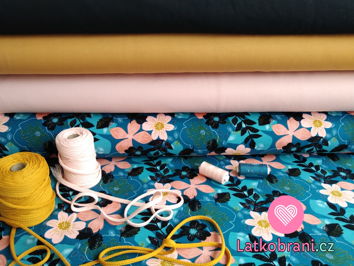 Teplákovina počesaná potisk barevné květiny na petrolejově zelené