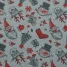 Teplákovina potisk zimní, vánoční sobi, sněhuláci, perníčky, stromečky na šedém melé