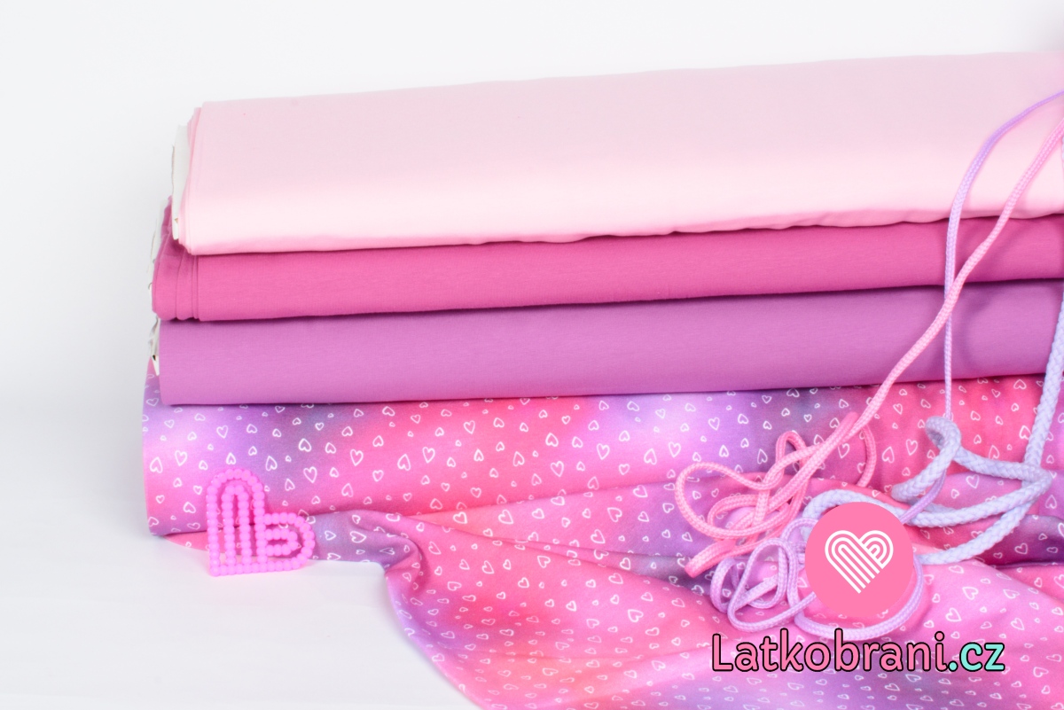 Teplákovina bílá srdíčka na magické růžové/levandulové