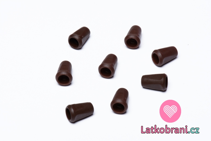 Základní komponent pro zakončení šňůrek, které lemují rukávy a spodní lem bund. Jednoduchý uzel ukončí šňůrku, koncovka jej schová a zabrání vytažení šnůrky z tunýlku. Rozměry: délka koncovky je 17mm, vnější spodní průměr je 8mm a vnitřní spodní průměr je 4mm. Vnější horní průměr je 12mm a vnitřní horní průměr je 7mm. Výška 17mm. Rozměry: 12 x 17 mm Průvlek: 4 mm BARVA: hnědá
