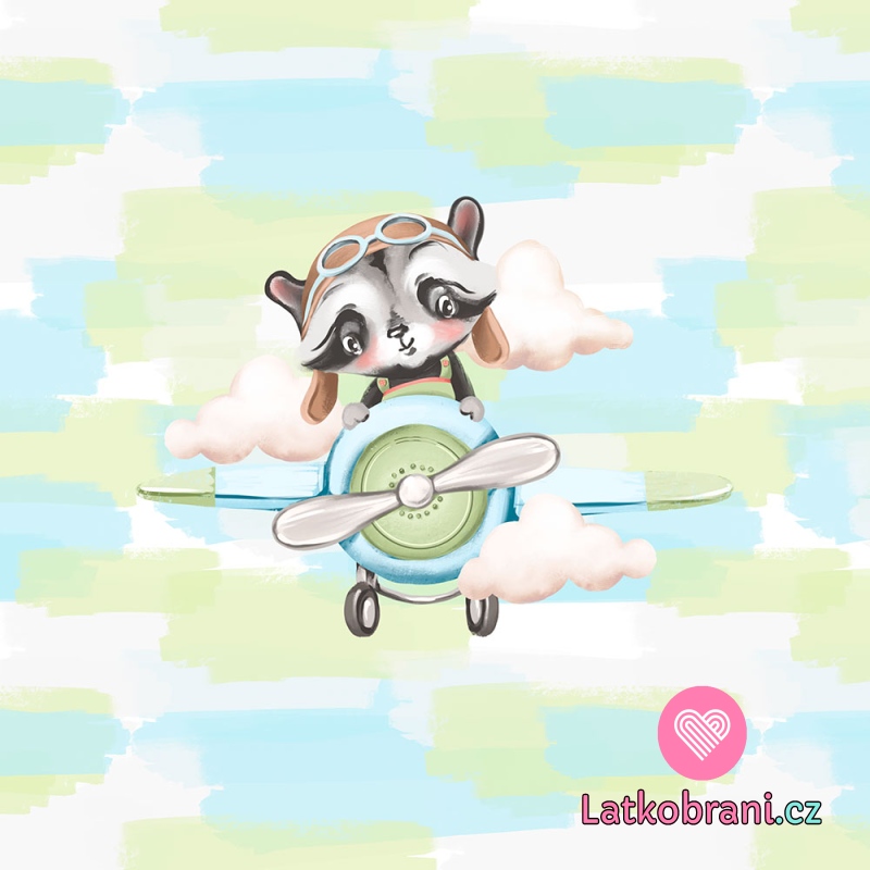 Třída 1 - Oděvy pro děti do 3 letTento panel s medvídkem mývalem je jako stvořený pro všechny malé piloty. :-) Pokud Vaše dítko zbožňuje letadélka a vše kolem nich, mám pro Vás tip na krásný dárek - ušijte mu třeba mikču z tohoto roztomilého panelu, bude nadšené! A vy s ním.:-) Panel je velmi příjemný na omak, je pružný a prodyšný.