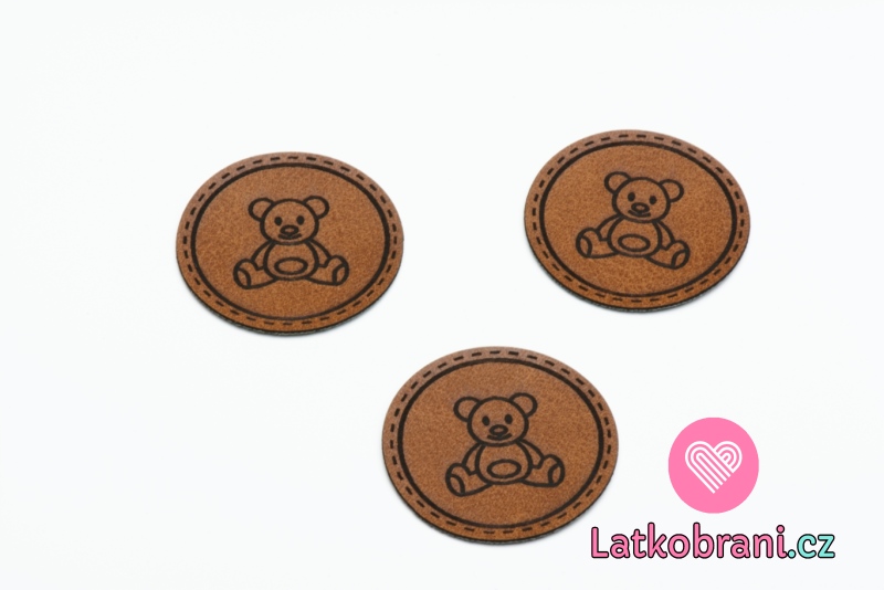 Elegantní kulatý štítek na oblečení s obrázkem medvídka.