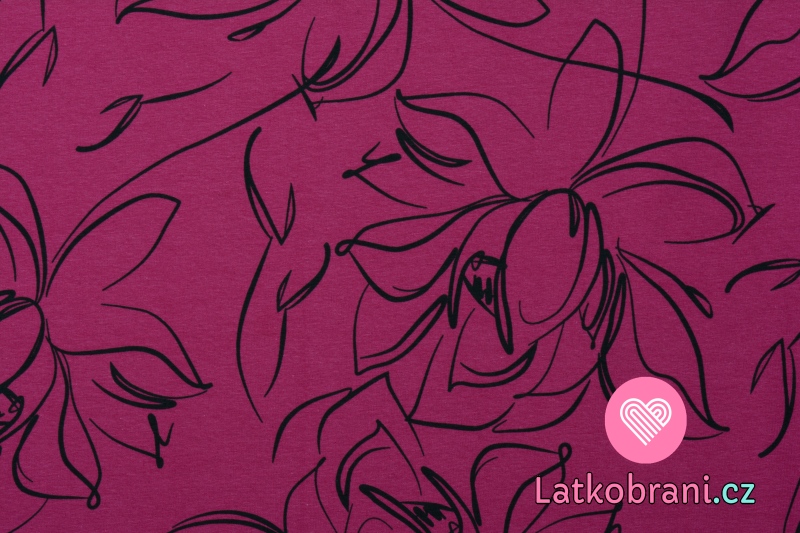 Teplákovina potisk černé květy na vínové