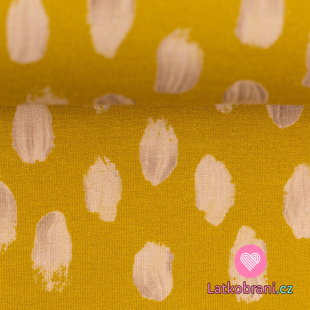 Teplákovina s příměsí modalu potisk bílé nepravidelné tahy štětcem na hořčicové