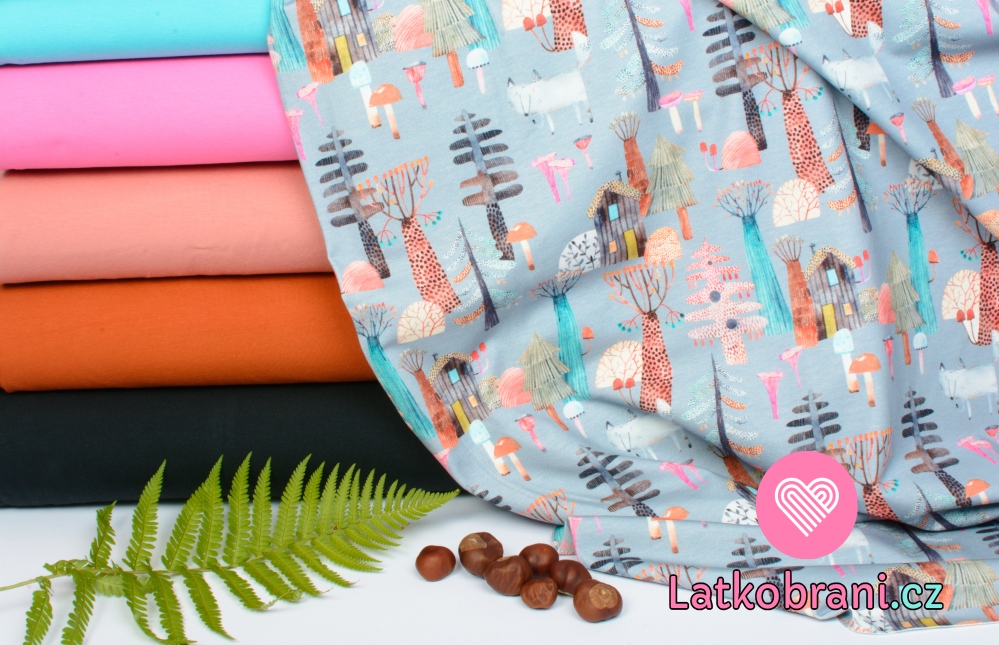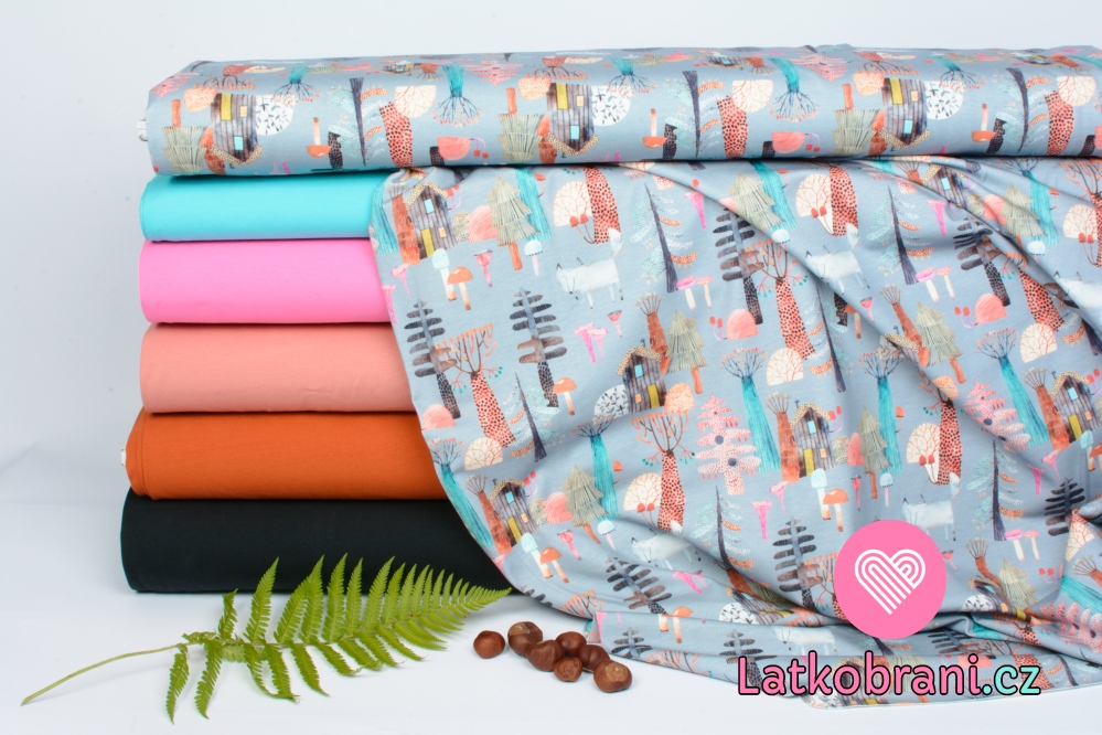 Úplet potisk chaloupka v kouzelném lese na modro-šedé
