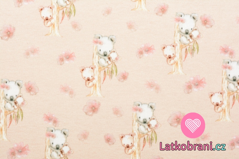 Úplet potisk koalí rodinka a růžové kytičky na růžové, BIO